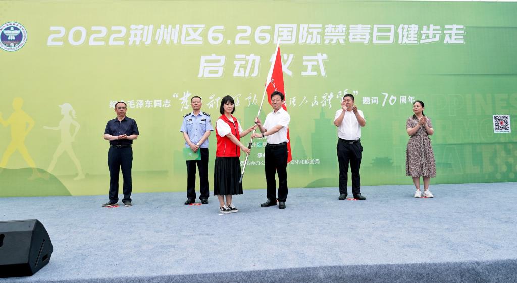 麒麟步、断毒路、齐出手、毒败走。禁毒宣传不仅要在理论中,要营造无毒健康氛围,宣传工作也要从运动中开展。6月24日上午,在“全民禁毒,健康生活”2022年荆州区“6.26”国际禁毒日健步走活动中,荆州区委常委、常务副区长周远栋向88858cc永利志愿者服务队授旗。