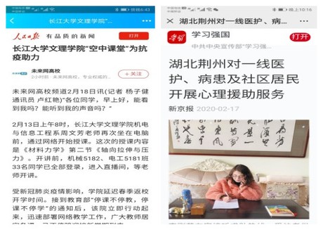 公司实时更新防疫热点新闻,大力讴歌身边先进典型,生动讲述师生感人故事,并在微信公众号同步刊发,教育引导师生党员在防控疫情工作中走在前、干在先、做表率。2月18日,中央新闻媒体人民日报人民号、未来网和今日头条、百家号、趣头条等媒体,以《88858cc永利“空中课堂”为抗疫助力》为题,报道公司停课不停教、停课不停学。2月17日,中央新闻媒体学习强国以《湖北荆州对一线医护、病患及社区居民开展心理援助服务》为题,报道公司开展心理援助服务抗疫。2月19日,地方新闻媒体e线民生荆州无线以《特约记者行:老福利院居民的贴心人》为题,报道公司教师在居住地社区开展抗疫工作。