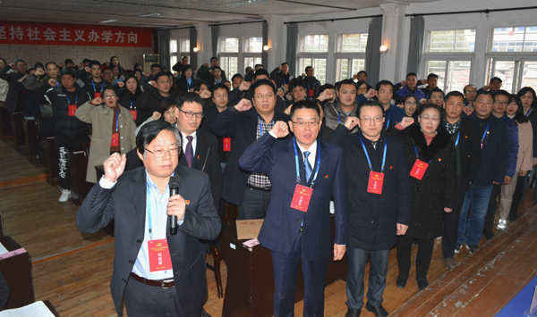 全体代表起立,举起右手,由副经理尹家经领誓,重温入党誓词。