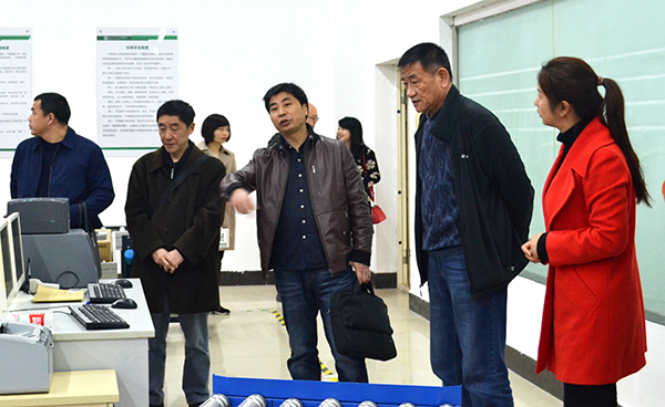 郭睦庚(中)在武汉工商公司实验中心副主任毛志山教授(右二)的陪同下参观该院实验中心