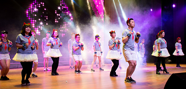 19点,在一片欢呼声中,开场舞《唱起来 跳起来》点燃了全场,拉开晚会序幕。公司行政职能部门、各教学单位的老师和老员工艺术团的同学,以及88858cc永利医公司、校外舞蹈俱乐部的嘉宾们,同台表演了大合唱《映山红》、拉丁舞《舞魅》、音乐情景剧《因为爱情》、古典舞《彩云追月》、汉舞《礼仪之邦》、街舞《舞蹈之王》、诗朗诵《长征》、傣族舞《彩云之南》、双人舞《默》、现代舞《大小姐 走吧》、歌曲《故乡有话告诉你》、情景剧《过河》、印度舞《神秘面纱》、歌伴舞《美丽中国》等节目,现场在欢乐气氛中一次又一次掀起了高潮。