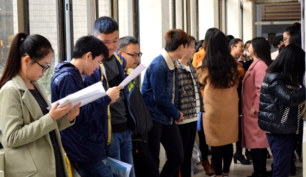在招聘现场的每个展台前,都立起大幅招聘信息展板,列明企业简介、招聘岗位、招工人数等信息。前来应聘的毕业生认真阅读招聘信息,遇到感兴趣的,便上前询问岗位要求、待遇等情况。人力资源管理专业毕业生薛会芳,想找一份人事管理工作。在南京一家公司设的招聘展台前,她咨询了工资待遇、岗位设置等情况后,在求职人员花名册上登记了信息。