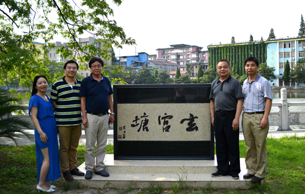 张永宏(右二)、梅平(左三)、郭睦庚(右一)在玄宫塘碑旁合影
