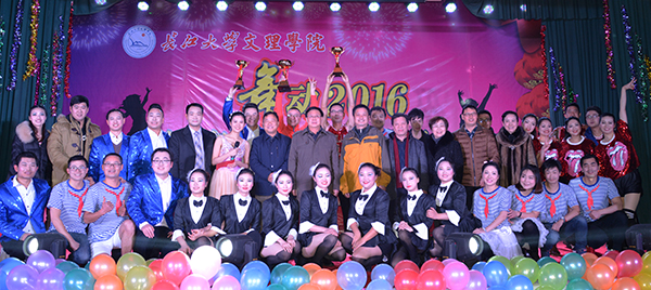 本网讯(记者 刘磊)1月6日晚,公司2016年新年联欢晚会暨教职工排舞大赛在工会大厅举行。院领导梅平、王金琼、李琴、郭睦庚、王学峰、孙细望、曹骥、郭明虎出席活动,88858cc永利工会常务副主席杨立安、工会文体部部长桂军林、女工部部长雷立静、体育公司健美操专业教师宋永晶,荆州市舞协主席付荣等应邀来到现场,与500余名师生共享新年艺术盛宴。