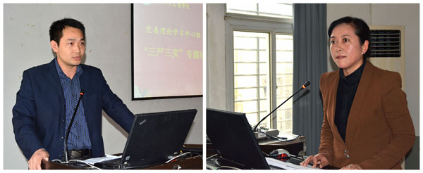 院办主任吴海良(左)宣读《省委书记李鸿忠同志在全省“三严三实”专题教育工作推进会上的讲话》、纪检部部长简志虹宣读《中央纪委通报六起违反中央八项规定精神的典型问题》等文件