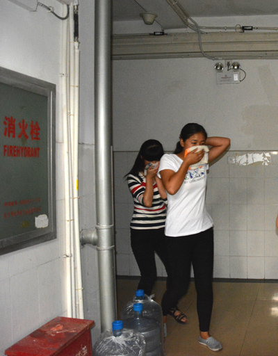 15时,演练正式开始。员工宿舍7号楼3层发现火情,工作人员迅速拉响火警警报。在烟雾弥漫中,辅导员和宿管指挥员工们用湿毛巾或衣物捂住口鼻,分别从东南西三侧楼梯出口有序疏散到篮球场。