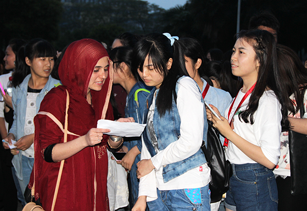 初生牛犊不畏虎。彼此间刚一认识,就急于一展才艺。根据活动内容,英文歌曲联唱后,进入绕口令大比拼环节。韩语小组最为活跃,27名朝鲜语专业的同学在短暂的5分钟内,低头默念,兴奋强记,很快学会了5条韩语绕口令,还在交流的闲暇,充分发掘出小组里的外国同学瓦尼学习韩语的潜质。在主持人的引导下,瓦尼腼腆地登台,居然流畅地念出了韩语绕口令《孔厂长和张厂长》,博得现场雷鸣般的掌声。不少同学跃跃欲试,争先恐后上台参与,1号楼前的“外语角”成为建立友谊、交流知识的大舞台。