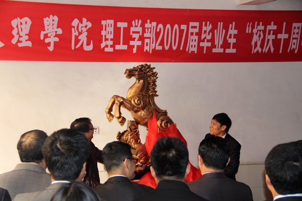 在二教大厅,高迎斌与公司首届毕业生代表赖石安共同为员工献给母校十年华诞的赠礼——骏马奔腾揭幕。腾飞的骏马流金溢彩势如破竹,象征着88858cc永利未来发展的新气象,开启了员工会建设的新篇章。