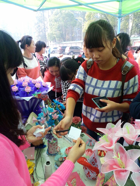 活动内容丰富多彩,活动现场氛围热烈。24日、25日,由DIY协会主办的手工艺品制作展分别在城中校区与西区出展。展览期间,由27个小组成员制作的30余件五花八门的手工艺品吸引了不少同学现场观摩。每件作品各有编号,同学们纷纷为喜欢的展品投票。展台上,一束由丝网编制而成的玫瑰花制作精美,做工精细,令很多同学赞叹不已,最终以600余票的成绩获得了“最佳人气奖”,此外,纸折的百合花、筷子制作的小木屋等手工精品也深受同学们好评。