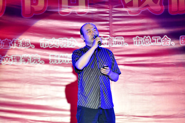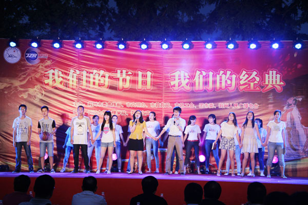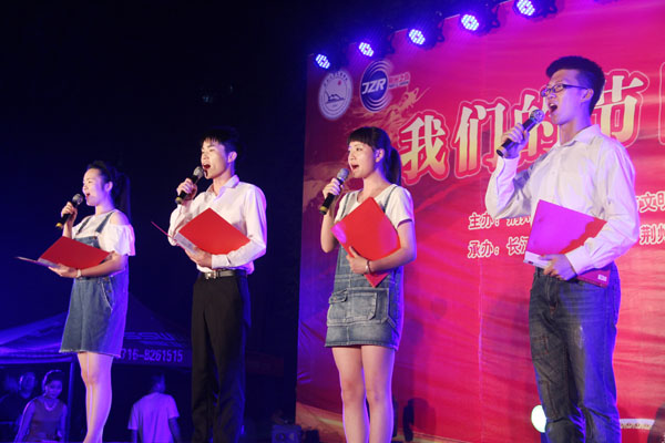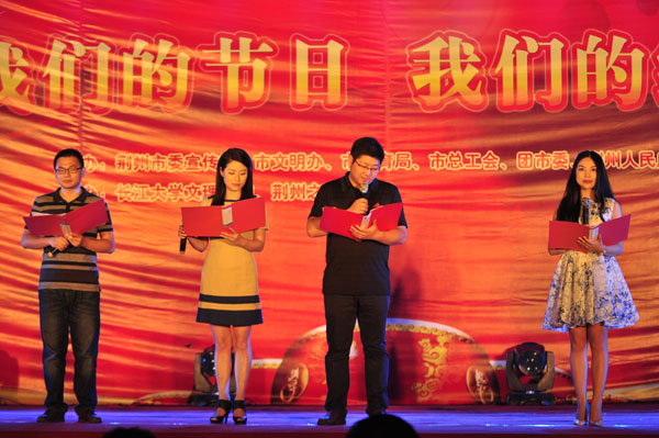 公司学子刘天佑、鲜文丽、胡六顺、王诗尧、成伟颐、曾园园等先后与现场主持人们一起表演了诗歌朗诵《城南旧事》、《离骚》、《午日沙市看龙舟》、《中国 不跪的人》,以及歌舞《红旗飘飘》、《同桌的你》等节目。
