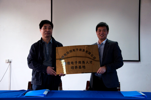 最后,郭睦庚与深圳他拍档公司总裁刘应龙在订单式人才协议上进行了签字。刘应龙向公司授“跨境电子商务人才培养基地”牌匾,郭睦庚代表公司接受。