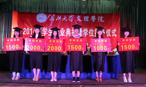 在激昂的乐曲声中,毕业生们依次上台,主席台的领导为优秀毕业生代表、考研学子颁发荣誉证书及奖金。