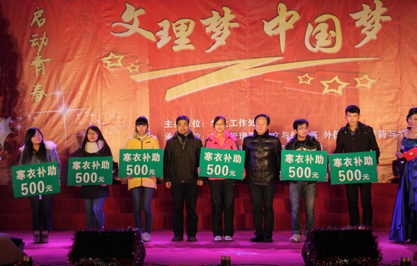 晚会火热进行的过程中,副经理郭睦庚及学工处负责人登台,为公司300余名寒门学子发放寒衣补助金,并寄语获得支助的学子在今后的学习生活中认真学习,感恩社会,回报祖国。