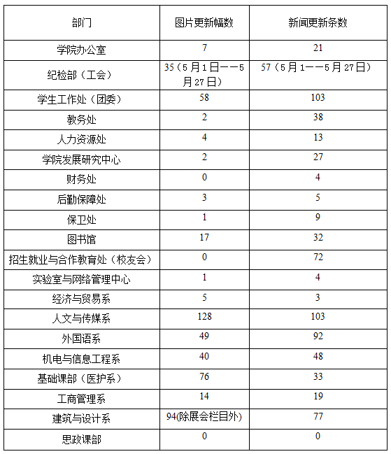 根据《关于开展校园二级网站检查的通知》,我部对全院二级网站开展了集中检查。经查,截止5月27日,各子网站信息更新情况如下,现予通报。