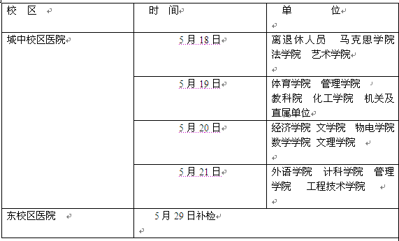 1、体检地点:城中校区医院。因特殊原因不能在规定时间检查的,可以到其他校区医院检查。5月29日安排在东校区医院进行补检,过时不再检查。