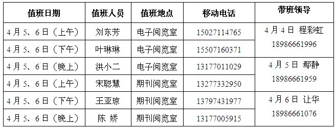 3. 4月5日(星期五)——4月6日(星期六)电子阅览室和自习室值班安排如下: