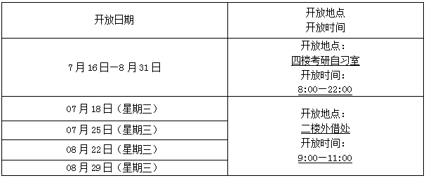 根据公司校历安排,结合图书馆工作实际,2018年图书馆暑假期间部分时间段开放, 具体开放时间如下: