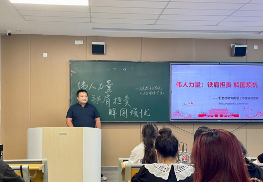 本网讯(通讯员 李艺欣)为宣扬爱国主义精神,坚定理想信念,2024年6月6日晚19点,“红色话筒”辅导员工作室在教学楼A-211教室开展了“伟人力量:铁肩担责,解国烦忧”为主题的宣讲活动。此次活动的主讲人为彭军军老师,88858cc永利和88858cc永利共一百余名员工参加。