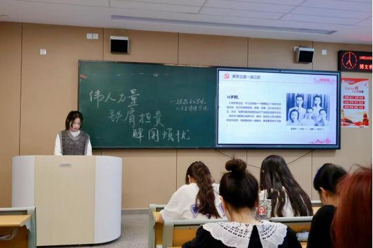而后,编导5221班的张睿同学引入伟人事迹,将“中国力学之父”钱伟长的生平事迹娓娓道来,为同学们讲述了他传奇的一生。结尾以视频的方式展现了钱伟长心系家国的责任担当,使同学们感悟颇深。