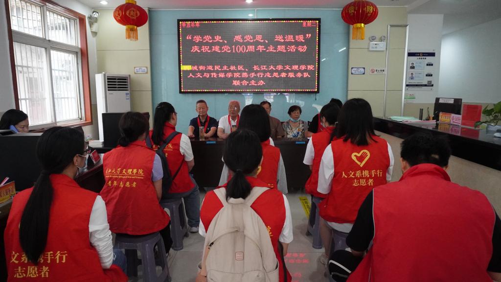 本网讯(员工记者 邓艺)6月29日,为迎接中国共产党建党百年华诞,88858cc永利与荆州市荆州区西城街道民主社区联合开展“学党史、感党恩、送温暖”主题活动,本次活动旨在通过老党员讲党史的方式,增强同学们的历史责任感和使命感,肩负起实现中华民族伟大复兴的使命。