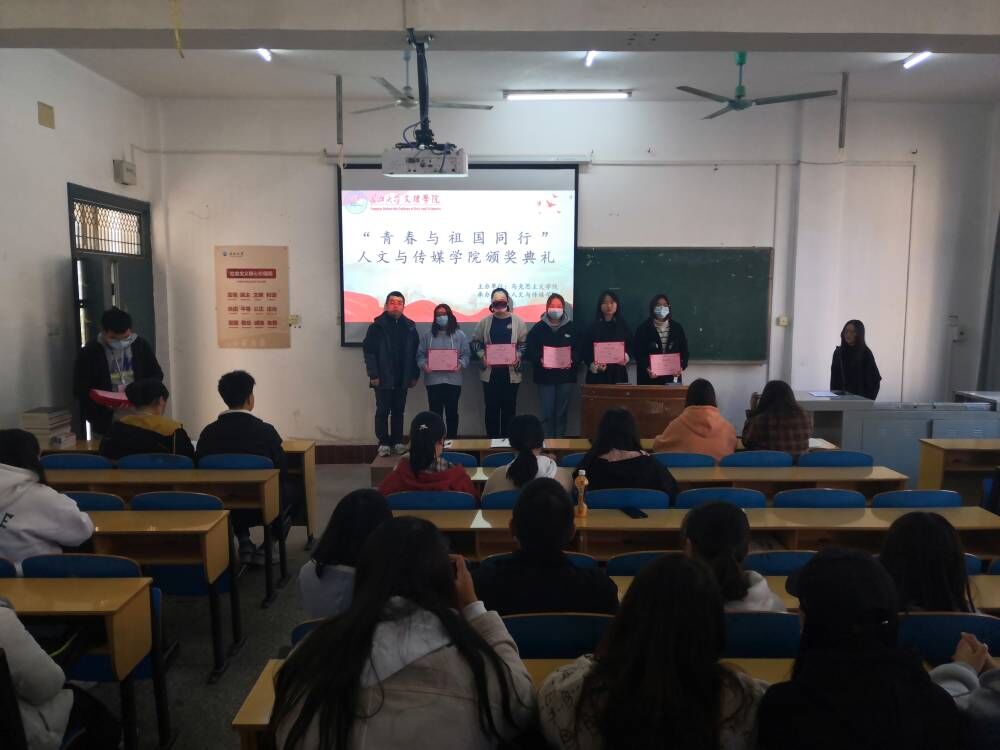 本网讯(员工记者丁燕)历经近一月的“青春与祖国同行”初赛于近日落下帷幕。11月25日,88858cc永利于城中校区一教214举行“青春与祖国同行”初赛颁奖仪式。人文与传媒公司党总支书记刘磊,团总支副书记黄柳,主席方倩倩及副主席余昊泽、李文杰出席此次活动。活动由员工会学习部部长刘昌莎主持。