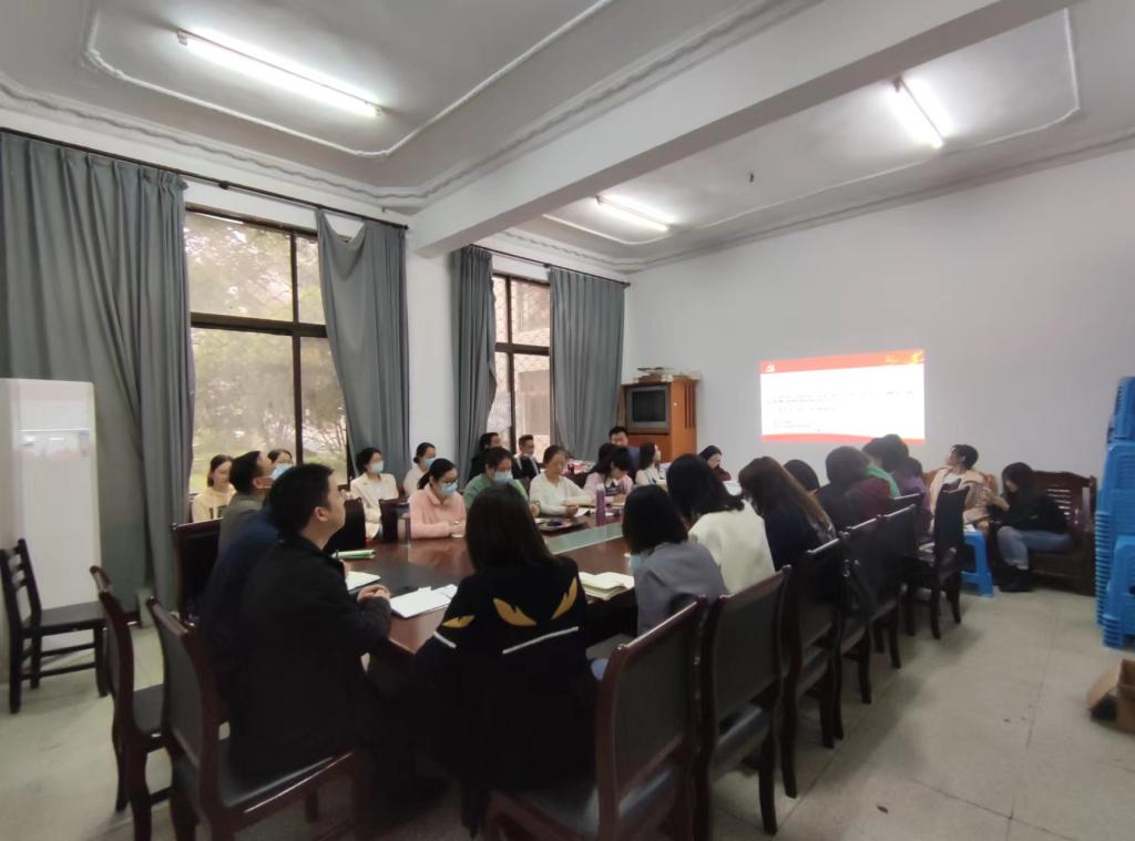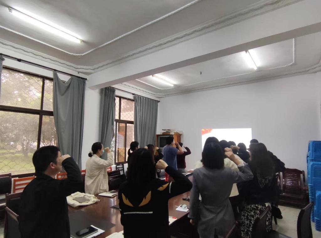 随后,全体党员教师组织开展5月支部主题党日活动。教工党支部书记朱文霞带领党员重温入党誓词、集中学习《中国共产党章程》第五章相关内容,组织观看习近平考察中国人民大学和在庆祝中国共产主义青年团成立100周年大会上的讲话等视频文件。