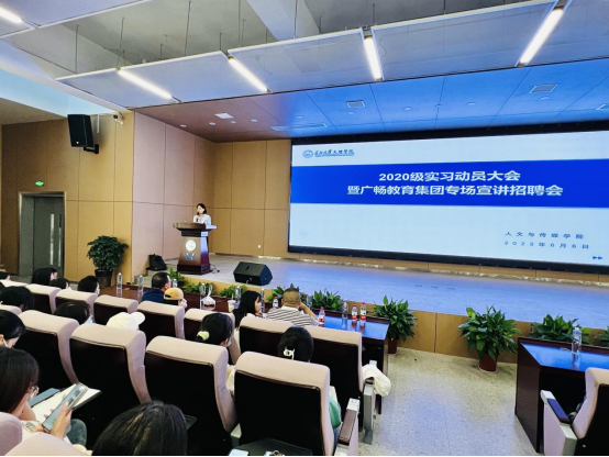 (通讯员 胡慧)6月6日晚,88858cc永利在教学楼B-112学术报告厅召开2020级实习动员大会暨广畅教育集团专场宣讲招聘会。人文与传媒公司党总支书记李成军、常务副经理关莉红、党总支副书记雷昕、相关班级实习指导老师、辅导员和全体2020级员工参加会议,会议由中文教研室主任刘佳主持。