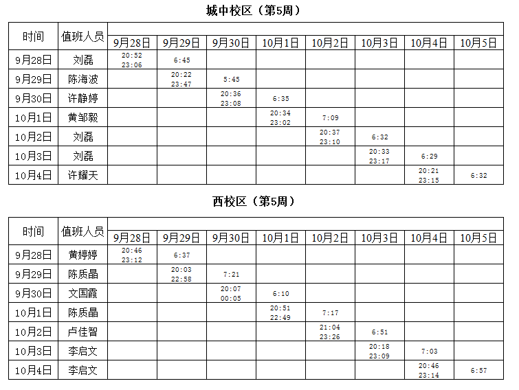 2020-2021学年第一学期第5周学工人员寝室值班通报