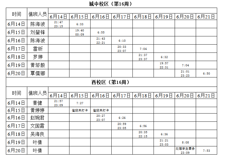 2020-2021学年第二学期第16-17周学工人员寝室值班通报