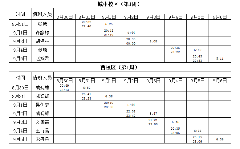2021-2022学年第1学期第1周学工人员寝室值班通报