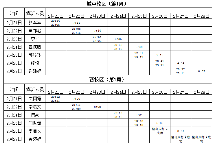 2021-2022学年第2学期第1-2周学工人员寝室值班通报