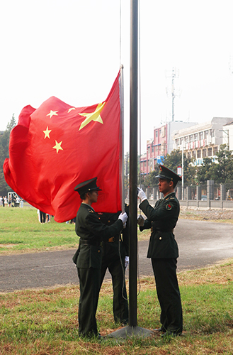 本网讯 今天(9月2日)早上6点40分,员工工作部(团委)组织2500余名大二大三员工,在城中校区操场举行了新学期第一次升国旗仪式。伴随昂扬的出旗曲,英姿飒爽的国旗护卫队队员迈着铿锵有力的步伐,护送鲜艳的五星红旗进场。在庄严的国歌声中,升旗手顺利完成升旗仪式。师生们向冉冉升起的五星红旗行注目礼、齐唱国歌。新学期,全院师生以蓬勃朝气踏上新征程。 通讯员 陈海波 员工记者 朱海燕 摄影报道