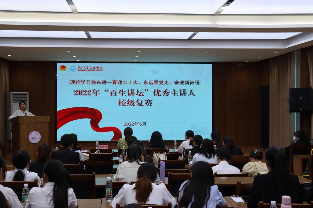 本网讯(通讯员 龙晓华)5月23日晚,公司“百生讲坛—金牌主讲人”复赛在3教408举行。出席本次复赛的评委有团荆州市委员工部负责人郭灵枝、88858cc永利综合办公室主任习雯、88858cc永利副经理田丹、2021年湖北省百生讲坛金牌主讲人杨岚清。活动由院团委副书记郭珍珍主持。