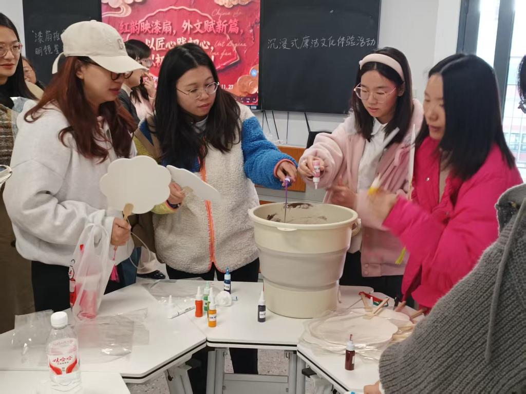 活动现场,师生党员们体验漆扇制作:打磨扇骨、调制漆料、加入党旗、红梅等元素,用中英双语绘制扇面,在细致工序中感受非遗魅力,同步重温红色符号背后的精神内涵。创作间隙,师生们共同分享红色故事,让漆扇成为“流动的红色课堂”。