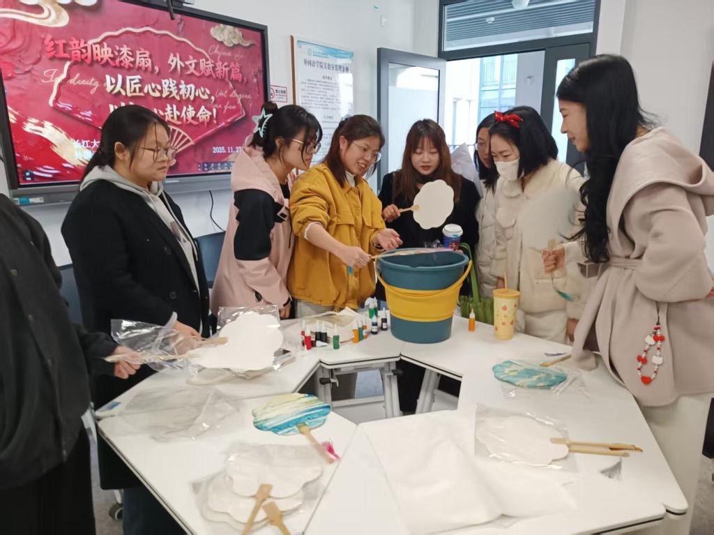 本网讯(通讯员 黄孝乂爻)2025年11月27日下午,88858cc永利全体师生党员于实验楼C414教室开展“红韵映漆扇 外文赋新篇”主题党日活动,以传统漆扇工艺为载体,让红色学习与非遗传承深度融合。
