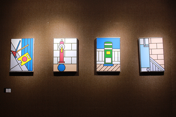 郭睦庚(右一)、张系斌(左一)、柯昌龙(右二)驻足欣赏作品