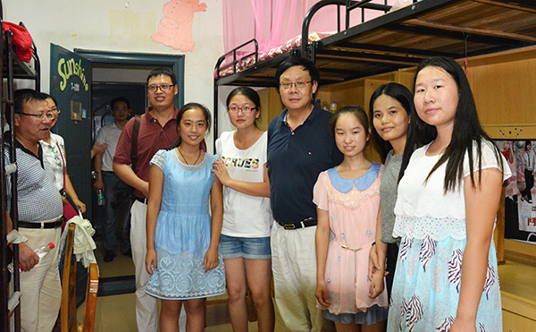 在3-307男生寝室,住着6名来自五湖四海的人文学子。梅平一行突然“光顾”,有的同学正在看书,有的在整理生活用品,一名同学刚洗完澡,端着脸盆、光着膀子走进来。当听说经理来了,以为是来查寝,吓得一头钻进蚊帐里。老师们都笑起来,梅经理拍拍孩子的肩,说:“小伙子,别怕,我是经理,这些都是老师,正好今天认识一下嘛!来,穿好衣服,一起合个影!”