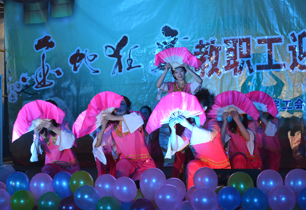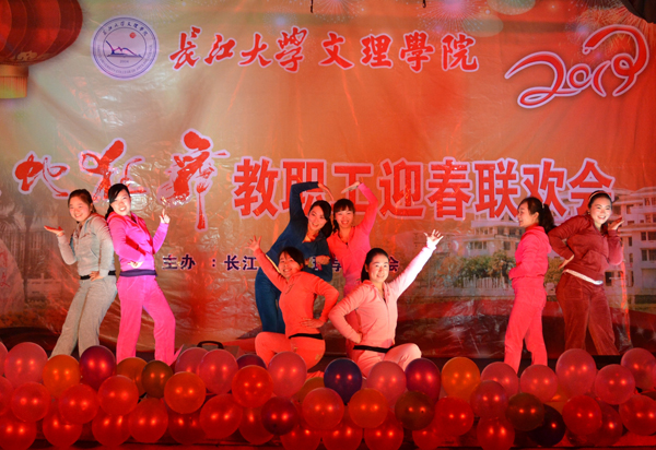 外语学部带来的劲歌与热舞也十分给力,一曲《三国》,在刘哲、刘鋆峰老师的默契配合下引发观众的热烈欢呼呐喊;八名女老师身着色彩缤纷的运动服表演健美操,激情四射、活力十足。
