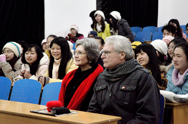 本网讯(记者刘磊 员工记者吴方阳)12月26日,美丽的校园雪后初霁。晚上7点,外语学部在1教112教室为两位即将返美的外教Terry和Gary举行欢送会。当晚,近200名外语学部员工参加了晚会。