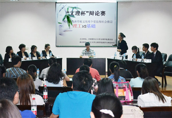 辩论赛以《精英文化和草根文化 你更推崇谁》为辩题,正方理工学部代表队和反方基础学部代表队,分别围绕所持观点“更应推崇精英文化”和“更应推崇草根文化”展开激烈辩论。