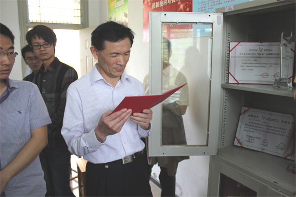 在ERP沙盘模拟实验室,大赛指导老师张菊向院领导介绍了培训工作的进程。公司党委书记袁先海仔细观看了荣誉展示柜,对员工取得的成绩表示欣慰和赞许,勉励同学们在荣誉的激励下再接再厉,蝉联魁首,创造辉煌。