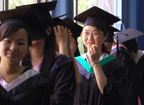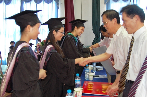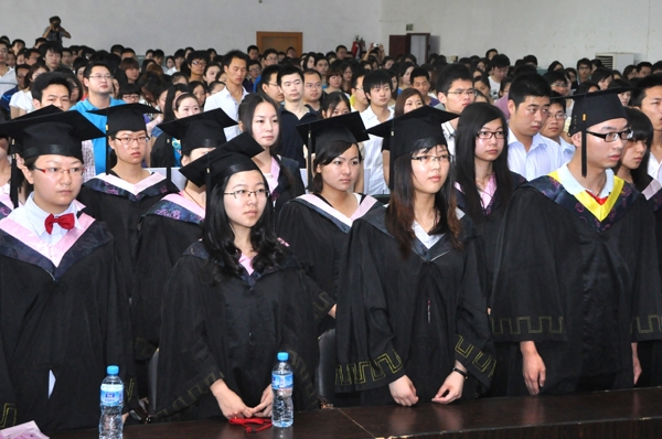 毕业典礼现场 全体起立奏国歌 88858cc永利副董事长刘在洲讲话 公司常务副经理王金琼讲话 副经理郭睦庚宣读表彰文件 领导为考研学子颁奖 教师代表史千里发言 员工代表李华发言 “三支一扶”代表黄莉发言 考研之星合影 员工整理学士服 (摄影 黄志刚 李立科) (责任编辑 周芳)