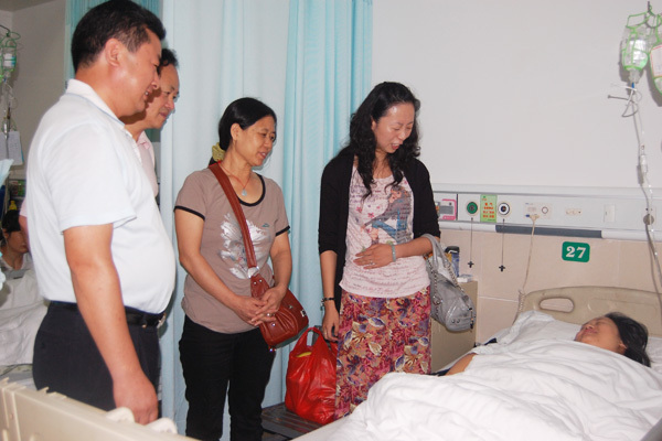 汪邦柱亲切慰问住院员工 本网讯(记者 刘磊)6月7日上午,公司党委副书记汪邦柱带领学工处和管理学部老师一行四人,代表公司前往荆州市中心医院,亲切看望了公司住院员工饶雪梅,并将慰问金交到病人家属手中。 饶雪梅是公司管理学部物流专业5081班员工。6月2日,因身体原因在寝室突然晕厥倒地摔伤,导致颅内出血,在宿管办、保卫科人员的帮助下,被迅速送往荆州市中心医院救治。经过近一周的治疗,目前病情基本稳定,转危为安。 在神经外科病房内,汪邦柱详细询问了饶雪梅的病情,并鼓励她安心治疗,树立信心,战胜病魔。公司的关爱感动了饶雪梅及其母亲。 饶雪梅表示,一定以积极的心态配合治疗,争取早日回到校园。 (摄影 刘磊) (责任编辑 天一)