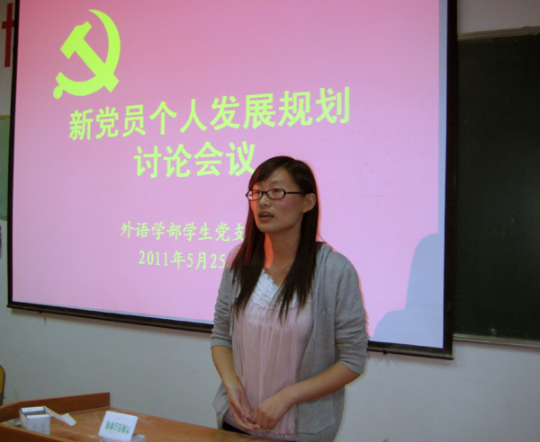 会上,近期通过支部大会的29名新党员作了个人中长期发展规划报告。英语5091班的纪宏梅表示,自己打算从事支教工作;英语5092班的罗军开始着手备考研究生;英韩5081班的张晓娇为通过韩语等级考试作了详细的学习计划;英日5081班的徐艳萍为努力成为一名教师提出了奋斗目标。