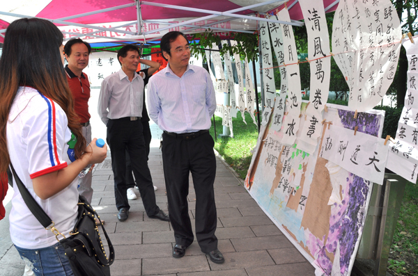 本网讯(员工记者 喻峰)五月的泮池,荷叶连连,荷香飘逸;五月的校园,绿树成荫,墨香扑鼻。5月16日上午,“泮池书韵”书画大赛在古泮池旁的林荫道上展开。公司领导沈光明、袁先海、王金琼、郭睦庚来到现场参观。
