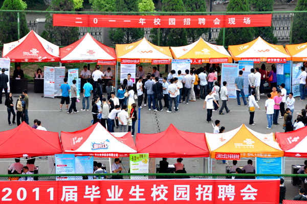 本网讯(记者 刘磊 员工记者 刘小芹)5月14日,公司2011届毕业生招聘会在公司体育场举办。来自长三角、珠三角、中部省市共计48家企业前来公司选才,为应届毕业生提供了2369个就业岗位。院领导沈光明、王金琼、郭睦庚亲临招聘会现场,深入用人单位和毕业生中详细了解招聘情况。学工处、各学部及相关部门负责人陪同。