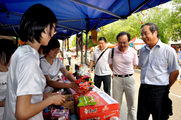 在校园主干道两侧,一排排橙色的帐篷下叫卖声不断,52个团队各出奇招,向大家展示自己的商品。