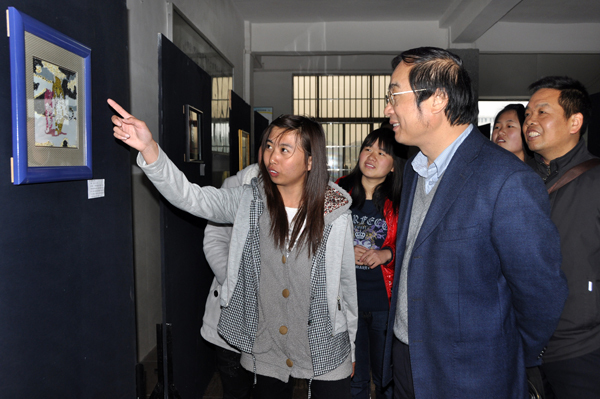 一幅幅精巧的艺术作品吸引了无数过往师生的眼球,沈光明仔细观看了同学们的作品,并对秦巨森等同学的作品给予了高度评价。他指出,09级艺设班是一个才子云集的班级,艺术展不仅让员工的作品得到了展示,还能使大家在艺术展的筹备的过程中得到锻炼,并希望在场的同学们多开展专业展览,加强各专业间的交流,共同学习。