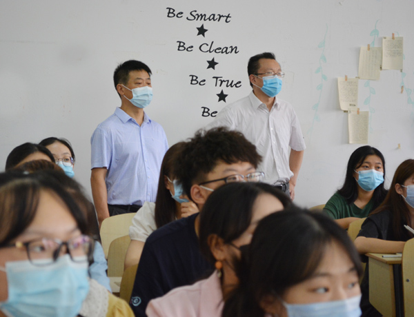 经理王文凯(右)、副经理康建虎深入课堂检查