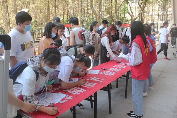 本网讯(通讯员 张宇琼)9月17至18日,管理系组织开展了拒绝餐饮浪费系列主题活动,引导师生从点滴做起,减少餐饮浪费,践行绿色生活,弘扬勤俭节约传统。 9月17日,各班以班会的形式开展线上主题学习,在辅导员的带领下,同学们集中学习了习近平总书记关于制止餐饮浪费行为的重要指示精神,观看了《焦点访谈》相关节目,并畅谈学习感悟,交流心得体会。18日,一批老员工志愿者自发组织主题签名活动,在印有相关内容的横幅上,师生纷纷签字承诺,将树立勤俭节约的生活理念,从我做起,拒绝餐桌浪费,文明用餐。 (图片由管理系提供) (责任编辑 刘磊)